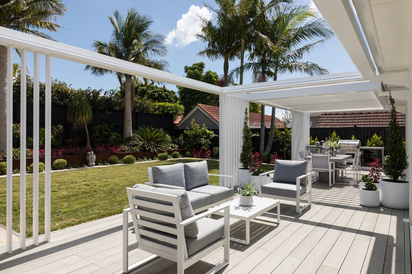 This contemporary garden design features generous outdoor living spaces with modern finishes; all enwrapped by lush, leafy planting.